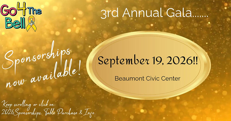 Go 4 The Bell presents its 3rd Annual Gala on September 19th, 2026 at the Beaumont Civic Center. This event raises monies that will stay in our local communities to assist our pediatric cancer patients and their families with their expenses. This will be our third gala and is expected to be a continued and long-term fundraising event in our area.